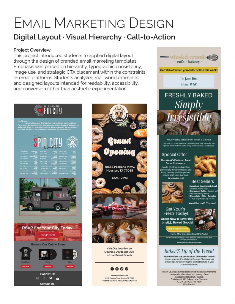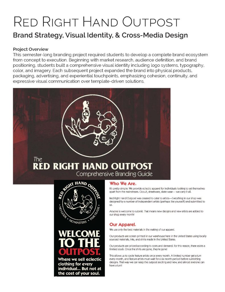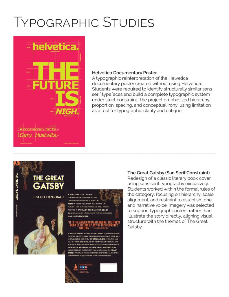 As a career educator and active industry professional, I continuously bring current standards, evolving practices, and real-world workflows—including branding systems, UX principles, and AI integration—directly into the studio classroom. My goal is to equip every student with the technical mastery, visual literacy, and critical thinking skills needed for both transfer to a BFA program and immediate workforce readiness.